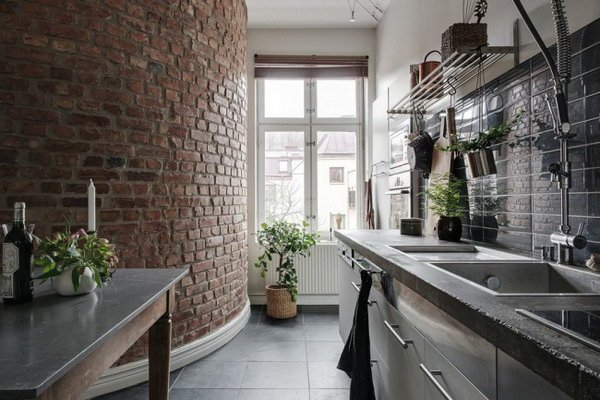 The raw brick wall is a nod to the loft style. Such a solution will fit well into the kitchen, where the surfaces are made of wood and a lot of metal elements and details.