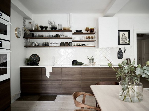 Open shelves look organic in the style of country, boho, Scandinavian. This technique is suitable for both large and small spaces. Open facades visually increase the space due to the air and the absence of overhanging heavy cabinets.