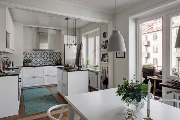 Color accents are good even in complete minimalism. For example, in a completely white kitchen, you can arrange multi-colored lamps.