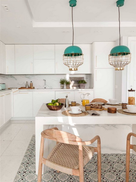 Kitchen furniture designed and made by Del Pino del Valle, where the table with the porcelain stoneware top that imitates marble, the chairs and the lamps also come from. Hydraulic mosaic floor from Secretos del Sur.