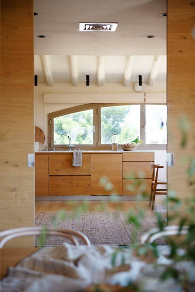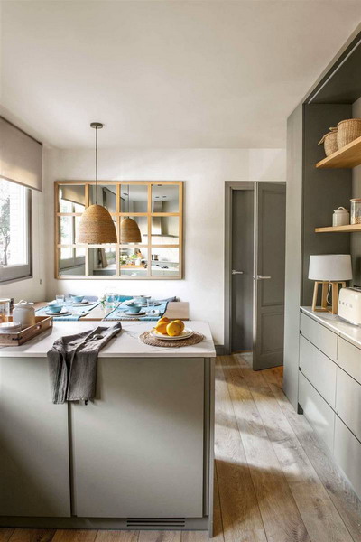Kitchen furniture designed by the decorator María Just and made by Fusteria Ramón Cornellá. Neolith worktop and jute rug from Calma House.