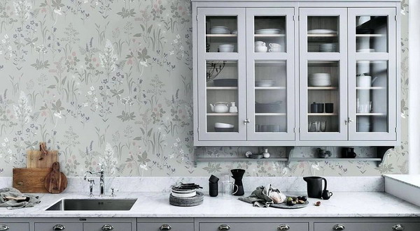 Images of foliage, twigs, trees and other greenery are also popular. In the photo, these trendy wallpaper trends 2024 for the kitchen look very fresh, add a touch of eco to the interior.