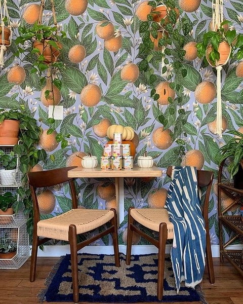 If you are attracted to a bright range, pay attention to prints with fruits, palm trees and an admixture of other colors. They are made by British designers. Using a bright coating as the main one is risky, the room may turn out to be too colorful. With their help, it is better to make an accent.