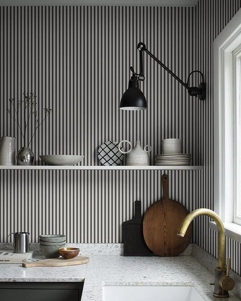 In this case, it is important that the materials are combined with the backsplash and countertop. It is safest to choose a neutral tile or stone for your work surface. If you like the idea of patterns, then try choosing tiles in the same palette as your accent wallpaper.