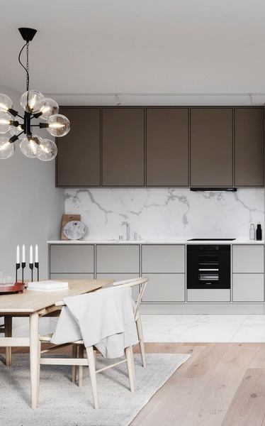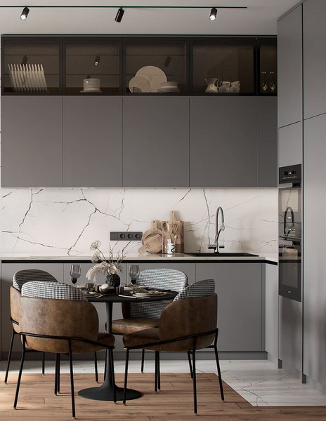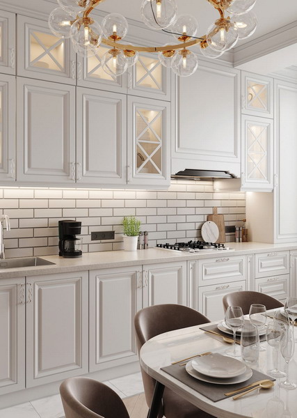 - Cabinets with white or gray fronts + white or gray walls;
