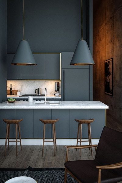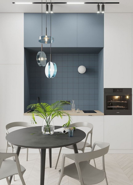 A cool tone will make a narrow kitchen more proportional. But it cannot be denied that this color is quite complex, since it absorbs light and visually makes the space deeper. For a similar color, it is better to choose laconic furniture. Light furniture looks good in combination with dark walls (brown, black).