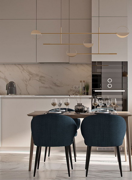 Pastel has always been associated with lightness and tenderness. It is perfect for a small kitchen, it will not overwhelm it and deprive it of lightness (especially a light pink tone, aqua, pale yellow, blue, sand).