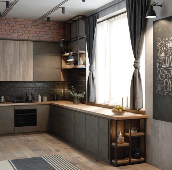A modern interior involves the use of different directions. New this year – single-level storage systems. Corner kitchens in 2022 are devoid of hinged parts. This is ideal for a loft-style space, allowing you to keep your kitchen utensils in sight.