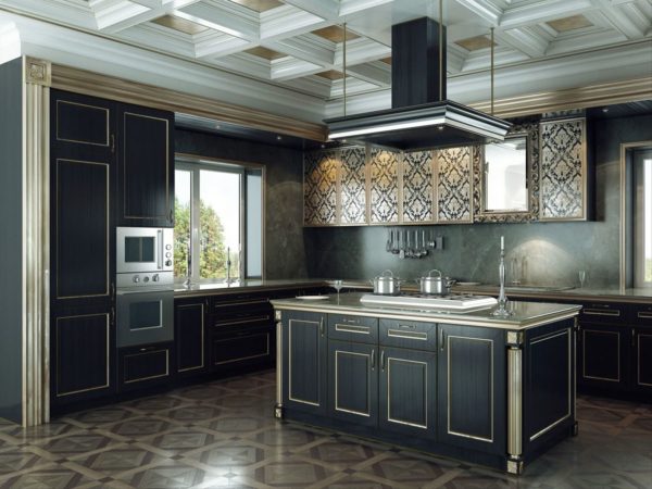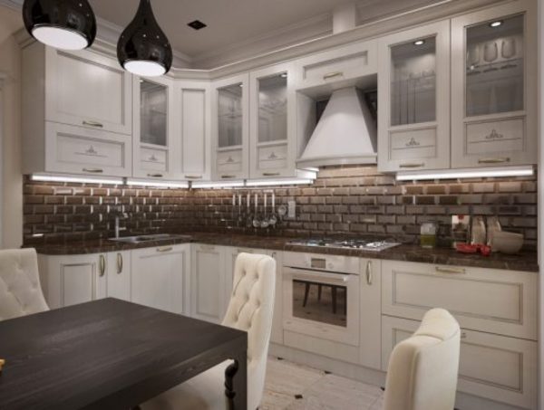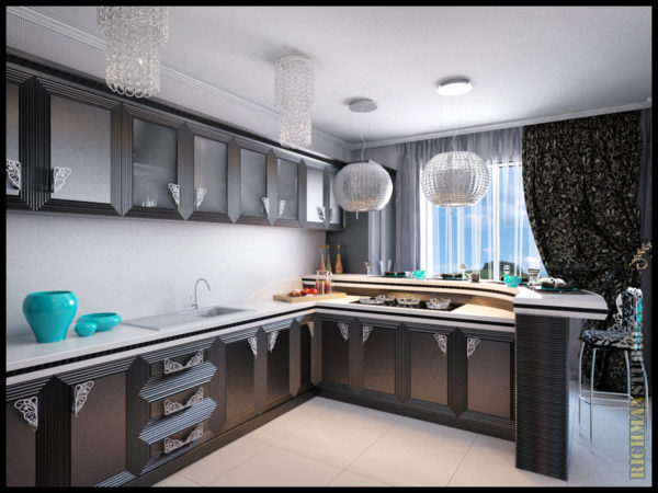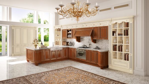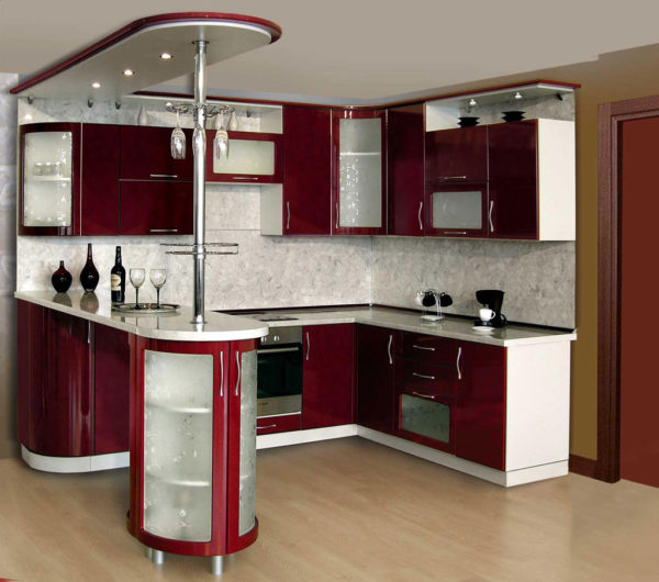 Most of the classic-style modifications are equipped with a bar counter. It can be a peninsula with an end floor cabinet. The L-shaped set is in demand for kitchens that are combined with the living room.