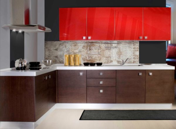 In a furniture kitchen set, a combination of black and white is allowed. Red and gray looks original. Black and orange will add a cozy atmosphere. White can be combined with all colors. Blue and brown are suitable for beige.