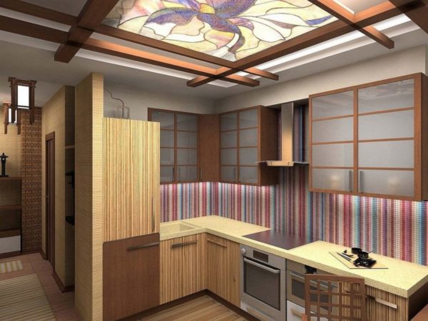 Restraint of the color palette, minimum details, uncomplicated interior. The kitchen apron is made in the form of a Japanese print. The predominance of orange. The ceiling is fitted with wooden slats. Textiles and furniture are made from natural raw materials.