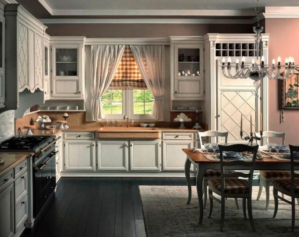 Characterized by the presence of natural materials of various textures, wicker details, decoration with rustic elements. Country prefers furniture in light colors. If this is the American version, it is better to install a dark typeface. Frame fronts are typical for kitchen sets of this style.
