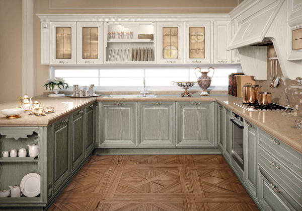 Kitchen cabinet doors are made of wood or glass. Such materials are traditionally used in the Italian direction.