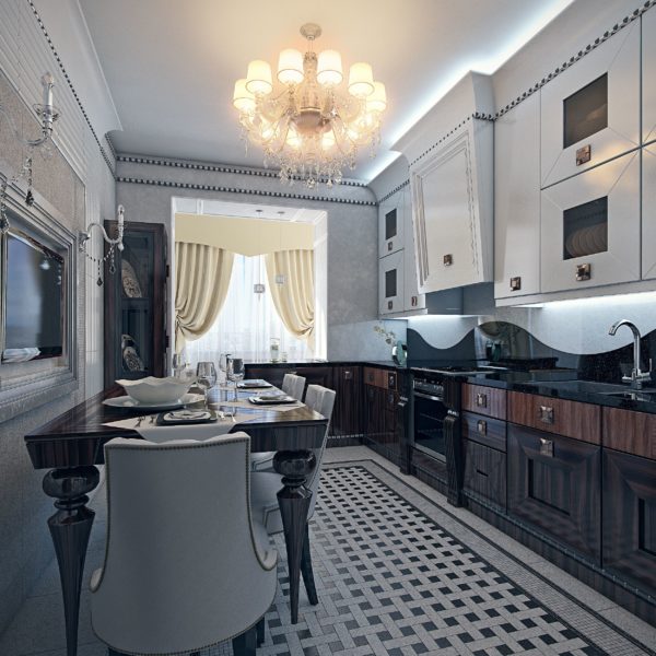 A mirror will help to enlarge the kitchen. It is the leading attribute of Art Deco. If space permits, it is better to place several mirrors.