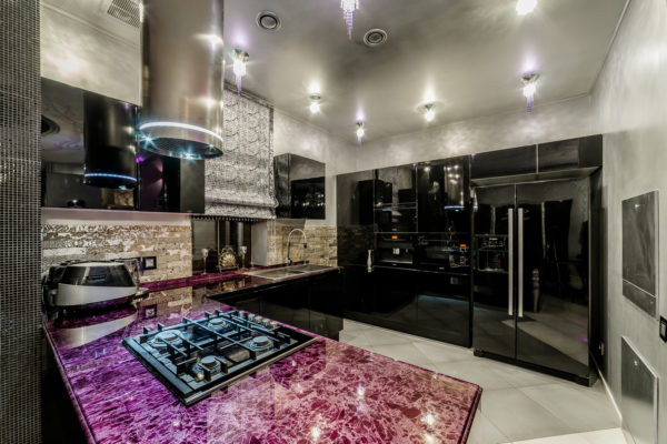 The strict design execution of a minimalist kitchen can be compensated for by smart fittings and hidden storage systems. In most cases, the headset is a built-in structure, the cabinets should merge together with the walls. Capacious modules and cabinets – pencil cases are required.