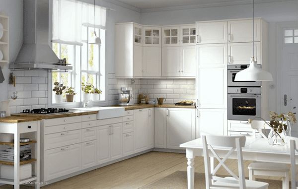 The facades are usually white and milky shades, or wood-like, the walls are light colors. Dark colors are used in small quantities, or completely excluded. So it can only be the dark color of the table, chairs, picture frames, decor elements, or the facade is made to look like light shades of wood.