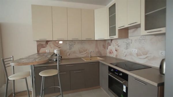 The bar counter is ideal for a corner kitchen, because sometimes it is not possible to place a dining table separately from the headset. It can accommodate both two and four, and it can also be used as a working area for cooking.