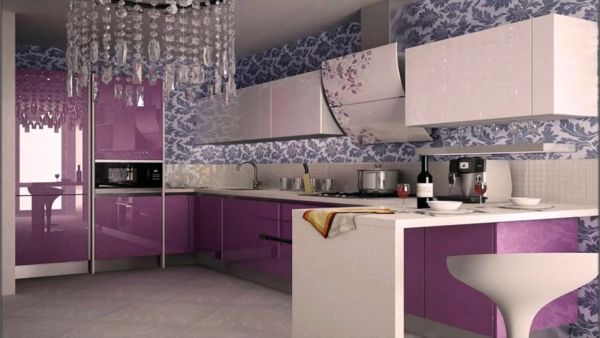 This style of kitchen design is distinguished by the colors used, mainly shades of black, graphite, dark brown. Some elements of the interior are highlighted in purple and blue. The location of lighting plays an important role, lamps of different textures and colors are placed both on the ceiling and on the walls. The division of zones is carried out without the use of partitions, but with the help of furniture and interior items. Usually they share a cooking area and a dining room.