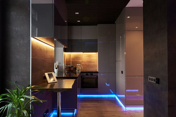 Since modern trends do not welcome zoning with finishing materials, designers widely use lighting effects.