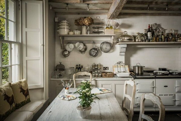 - 2-3-level hanging cabinets, furniture sets with mezzanines are in fashion. Another popular solution for rustic interiors is open shelves and cabinets without doors, covered with textile curtains.