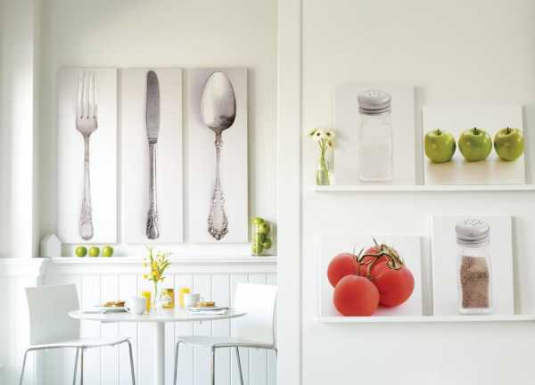 Owners of small apartments try to use every square centimeter of the kitchen with benefit and often ignore the wall design, preferring functional shelves to decorative decorations. In my article “We optimize the space in a small kitchen”, I wrote that even in the smallest room, if you wish, you can place everything you need and compare it with the phenomenon of a women’s handbag – what we really need is easily placed in a small clutch. I suggest using these tips and getting rid of unnecessary utensils, then instead of boring shelves on the walls you can hang pictures and original little things that will make the kitchen more comfortable and give the interior an individuality.