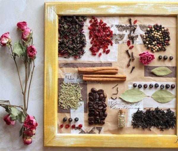 Such collages in the kitchen can be done with your own hands. When compiling them, they use medium-sized porcelain dishes (including from children’s doll sets), cutlery, beautiful tea cups. For home-made collages it is better to choose deep frames, they favorably shade even the most uncomplicated compositions. Here are some ideas in photos specifically for needlewomen.
