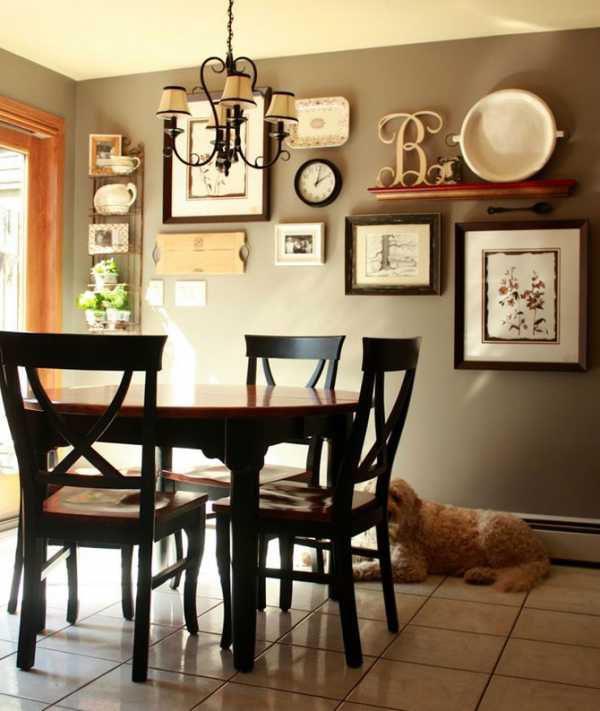 It is desirable that the plots of images placed in the dining room area be associated with food and drinks. Pictures on the theme of winemaking, still lifes and photographs of gourmet dishes look on the walls of the kitchen naturally and harmoniously. This is a pleasant tradition that has developed over the years. Enhance the effect with a narrow shelf or display with your favorite cookbooks.