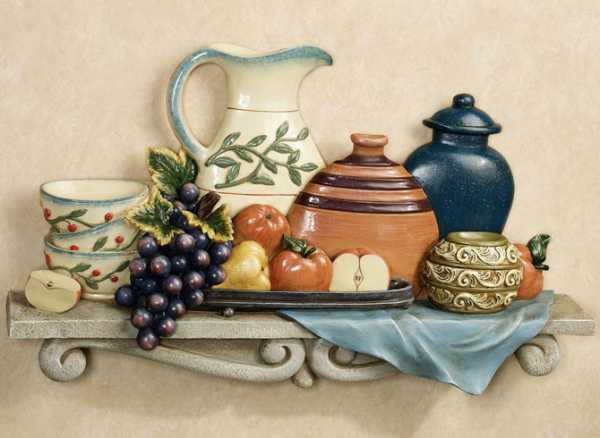 To decorate the wall in the kitchen, paintings, volumetric images, bas-reliefs, as well as decorative dishes, fabric drapery, carved wooden elements are used. Let’s consider more in detail varieties of decor.