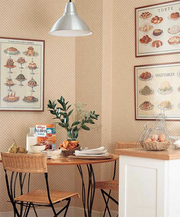For example, wallpaper with small flowers, floral ornaments or images of fruits and vegetables can decorate any room.