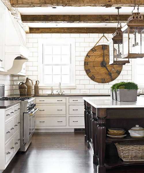 An unusual wall decoration in the kitchen is a large wall clock. They can be mounted directly on a vertical surface, a clockwork mechanism is used for the hands to work. The fantasy of the owners often replaces the usual arrows with cutlery (forks and knives). Also, instruments (spoons and spoons) can indicate the dial.
