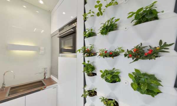 Living vegetation, indoor flowers add optimism, confidence and tranquility to any interior. To enhance the impression of being close to nature, you can use a small aquarium mounted in the kitchen wall.