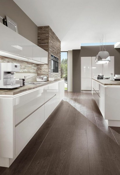 Modern fashionable kitchen interiors are characterized by the presence of discreet wall decoration. The main trend is the lack of ceiling cornices in the interior and multilayer fixtures. Matte plain walls with contrasting inserts are a popular trend of this season. Panels made of stone, wood, ceramic tiles look very advantageous. Less gloss is used.