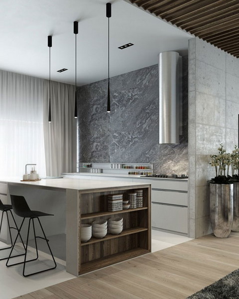 And the very concept of minimalism style in new kitchens has slightly changed. Instead of monotonous and contrasting black and white combinations, original tandems of matte gray and natural wood came into fashion. This kitchen looks very elegant and impressive.
