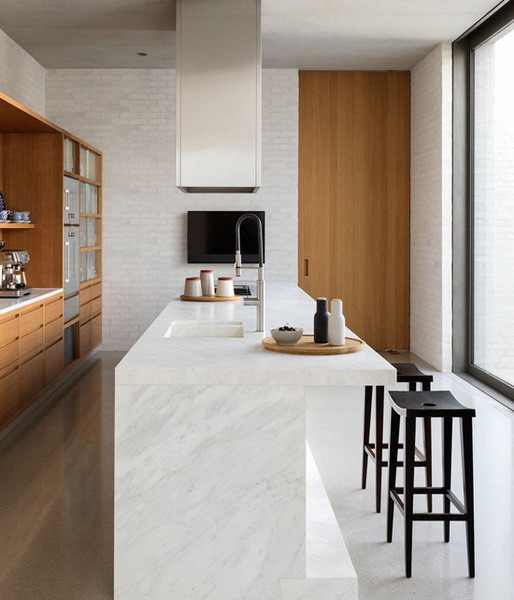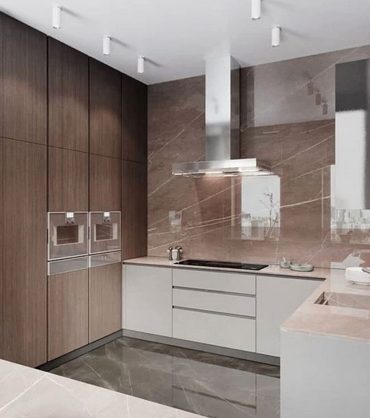 Marble finishes in modern kitchens will always find their use, even if the design is very simple or discreet. This is especially true for kitchen countertops. The material can also be used as a floor covering and in the creation of a monolithic “island” or apron.