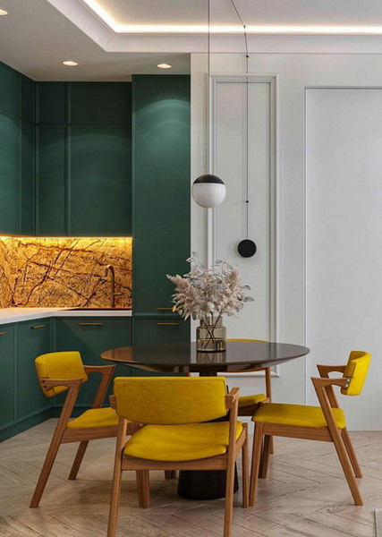 A color inspired by nature will remain popular for years to come. It is used in the design of not only a headset, but also walls, an apron. Green kitchen cabinets will be a key new style element. Green can be as dramatic as it is luxurious when used in the kitchen.