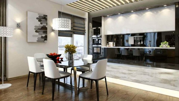 Does not lose popularity and the method of contrast. Many designers continue to combine black and white, and they do it quite well. If you want to dilute this contrast and give it a little smoothness in the transition from one shade to another, choose wooden inserts, such as countertops, facades of built-in furniture, table or chairs.
