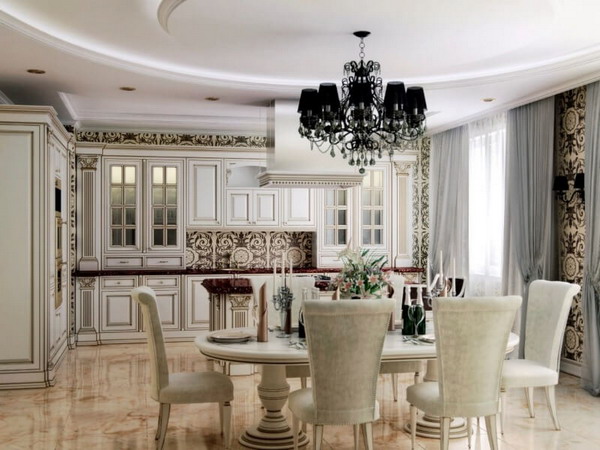 2. A massive chandelier in the center of the room is probably the main element of this style of interior. Ideally, it should be made of crystal or glass.