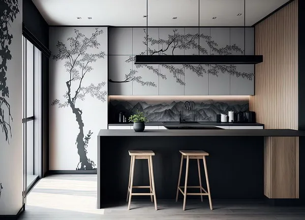 The term is made up of “Japan” and “Scandi” and stands for the combination of Japanese minimalism and Scandinavian cosiness. The natural colors from Scandinavia are also in the foreground with Japandi. By mixing with the Japanese furnishing style, strong color nuances, especially black, but also dark blue, aubergine and dark green and red tones are possible. The clear Scandinavian look meets the likewise high-quality, straightforward and above all practical aesthetics from Japan. For the kitchen, this means clear lines, handle-free looks, high-quality furniture, natural materials and a small number of functional decorative objects. Wooden struts on the fronts reinforce the Asian flair.