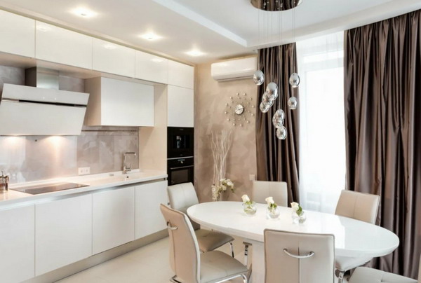 A beige kitchen is always able to create an overall impression of sophistication and tenderness in an apartment. White-tone wallpapers can perfectly complement the delicate sand set. The room in such a duet turns out to be bright and uplifting.