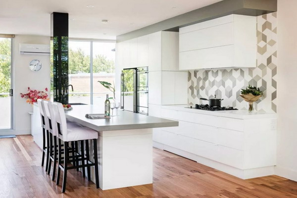 In the event that white wallpaper seems too simple for the kitchen, you can opt for snow-white wallpaper with an interesting dark pattern.