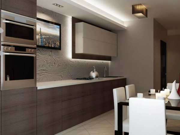 In compact kitchens, of course, it is best to give preference to light-colored wallpaper, because it is they who are able to visually make even the narrowest and smallest space wider. Light walls can be complemented with interior details similar in tone: for example, white blinds and beige delicate tulle. Dark colors tend to “hide” the space and visually make the walls narrower.