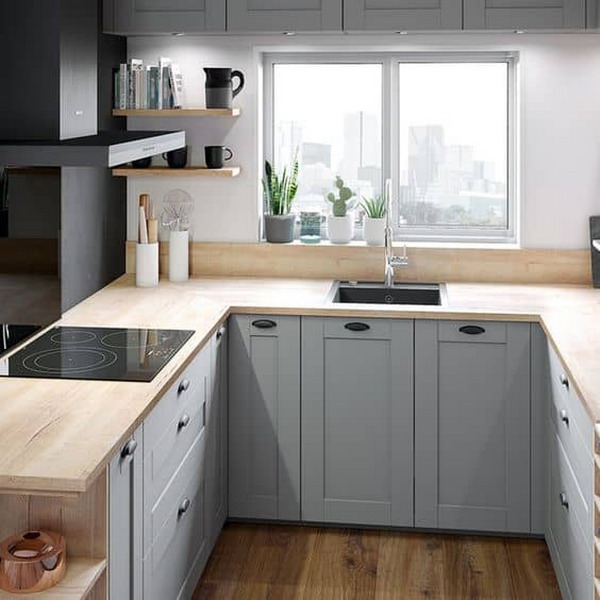 The L layout is suitable for all rooms and particularly for those in the shape of a rectangle. This layout is perfect for installing a kitchen table for meals or as an additional worktop.
