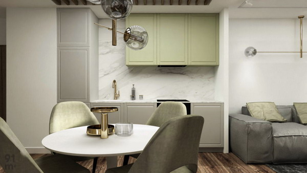 In this case, we recommend rather pastels, which return in favor of kitchen compositions in the style of the 70s. However, if you have a large area, we recommend choosing furniture with green facades and classic legs. Doors with glass facades should be fixed on the upper cabinets, for which the dishes will look beautiful.