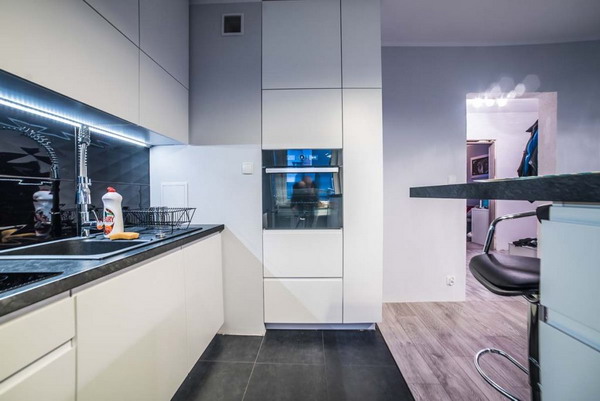 For consistency of the concept, it is necessary that all equipment is also black, without adding other colors and steel. Thanks to this combination, the interior looks very elegant thanks to black, and at the same time, it is cozy and warm thanks to the wood.