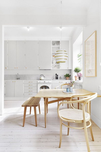 When it comes to lighting, an industrial strip with spotlights and a pendant lamp made from rattan lampshade will do here. With white kitchen furniture, you can easily change the style of the kitchen, replacing only accessories.