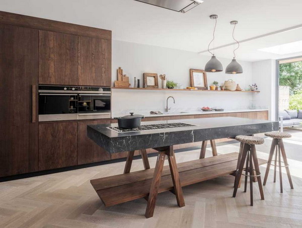 If you want to take advantage of the latest trends in the repair of your kitchen, you must choose a combination of black and wood. Furniture with wooden facades made of transparent grain, such as European walnut, will look great in company with a black countertop, as well as with black painted walls.
