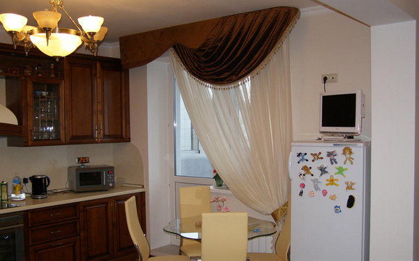 Interesting! Lambrequins are often chosen for the embodiment of non-standard ideas. This is one of the new design trends that has replaced traditional rings. For example, asymmetric models are used for a window with a balcony door, which allows you to create balance in the external decoration of the window. This solution looks stylish and organic.