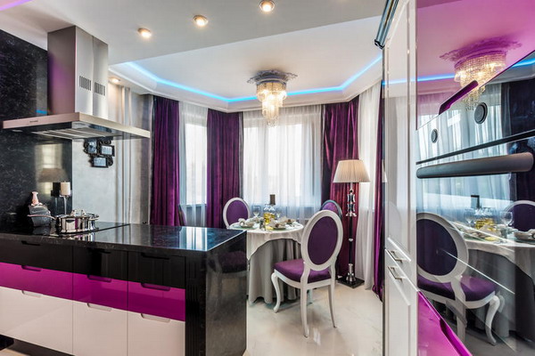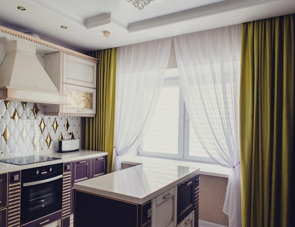 Classic long curtains on the floor bring elegance to the interior, visually raise the ceiling and stretch the walls. Models of long curtains, as a rule, are made of dense materials. When choosing such curtains for the kitchen, remember that they need careful care, but they look incredibly sophisticated.