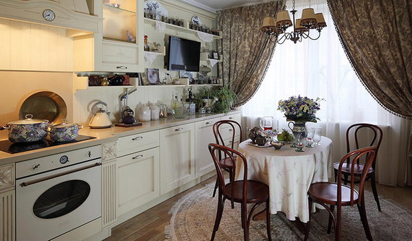 If the interior of your kitchen is made in a classic style, then it will not be difficult to choose curtains. In combination with noble furniture made from natural materials in warm colors, you can choose heavy floor curtains. The current classic shades are beige and brown.