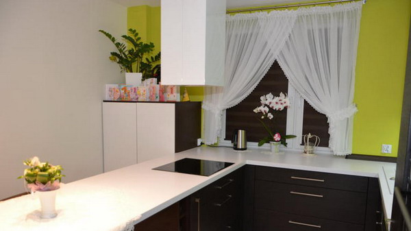 If the kitchen is very small, then the window sill can be converted into a worktop. So that window textiles do not create inconvenience, a Roman or roller blind will do.
